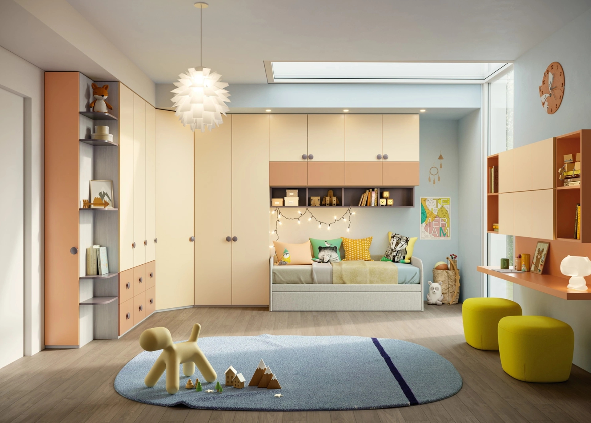 Questa proposta in laccato opaco ultima perfettamente le doti pratiche e l'estetica della camaretta, in quanto è capace di unire funzionalità ed ergonomia. Giessegi offre una ricca gamma di elementi accessori da accostare su misura: troverai letto, armadio o cabina armadio, scrivania, sedie e librerie. Porta estetica e cromie vivaci nella stanza dedicata ai più piccoli con questa soluzione, una delle Camerette a ponte per bambine di Giessegi. Nella progettazione della stanza dei piccoli affidati a noi: nel nostro punto vendita presentiamo tutte le più belle composizioni moderne per la loro camera.