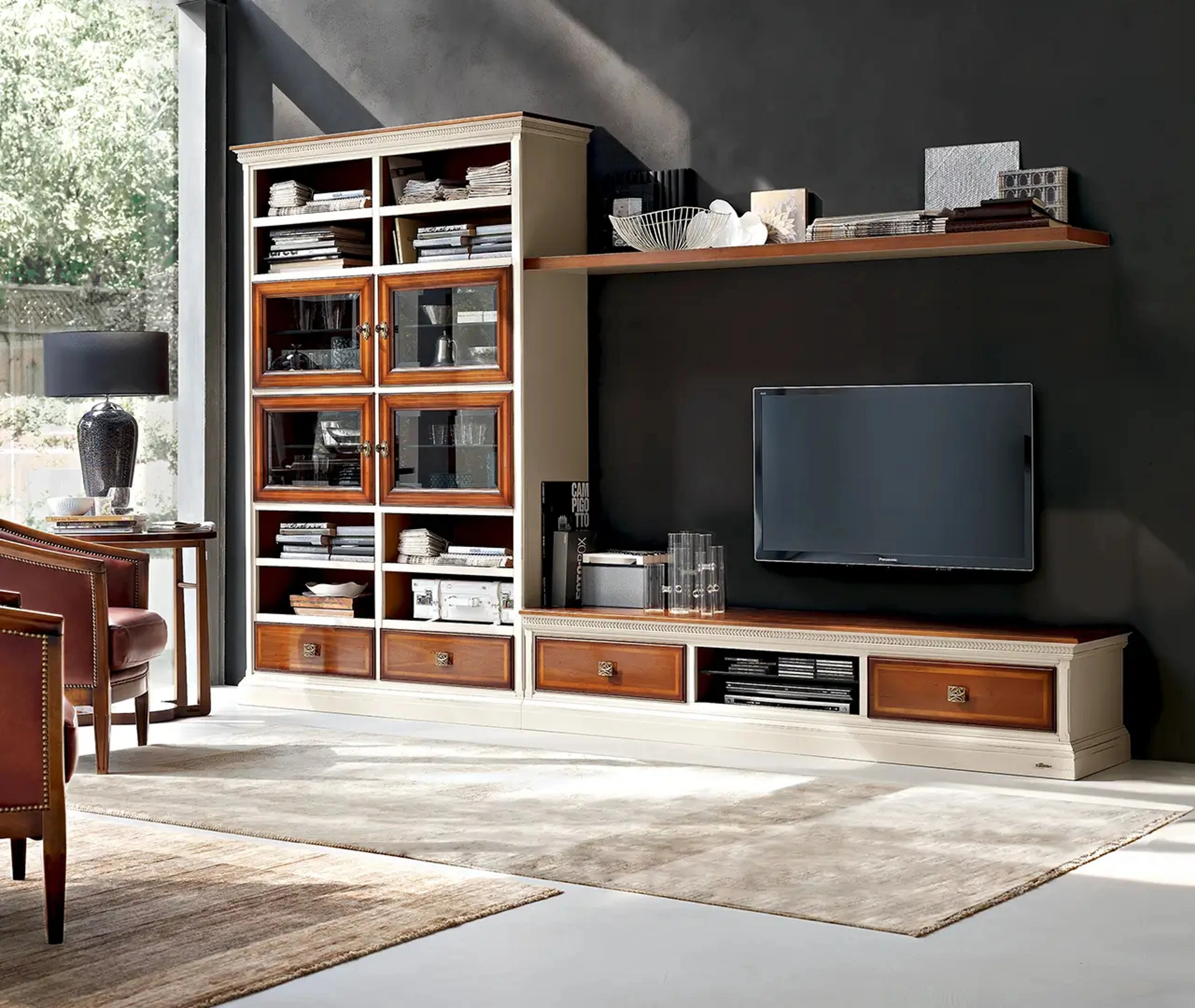 La Parete Attrezzata classica I Ciliegi composizione 03 di Le Fablier nell'immagine è una delle più belle soluzioni d’arredo in commercio: componibilità personalizzabile e le differenti opportunità di progettazione la rendono bella e funzionale. Le Fablier offre a catalogo originali modelli di mobili soggiorno, diversi per stile e forme, finiture e accessori: scopri nel nostro showroom l'Arredamento Casa a Tivoli delle migliori marche. I mobili soggiorno in legno dalle linee classiche come il modello nell'immagine sono davvero poliedrici e capaci di allestire il soggiorno usufruendo al meglio di ogni angolo. Poiché il living deve essere uno spazio agevole e bello a vedersi, sono indispensabili alcuni arredi belli e pratici come le Pareti Attrezzate.