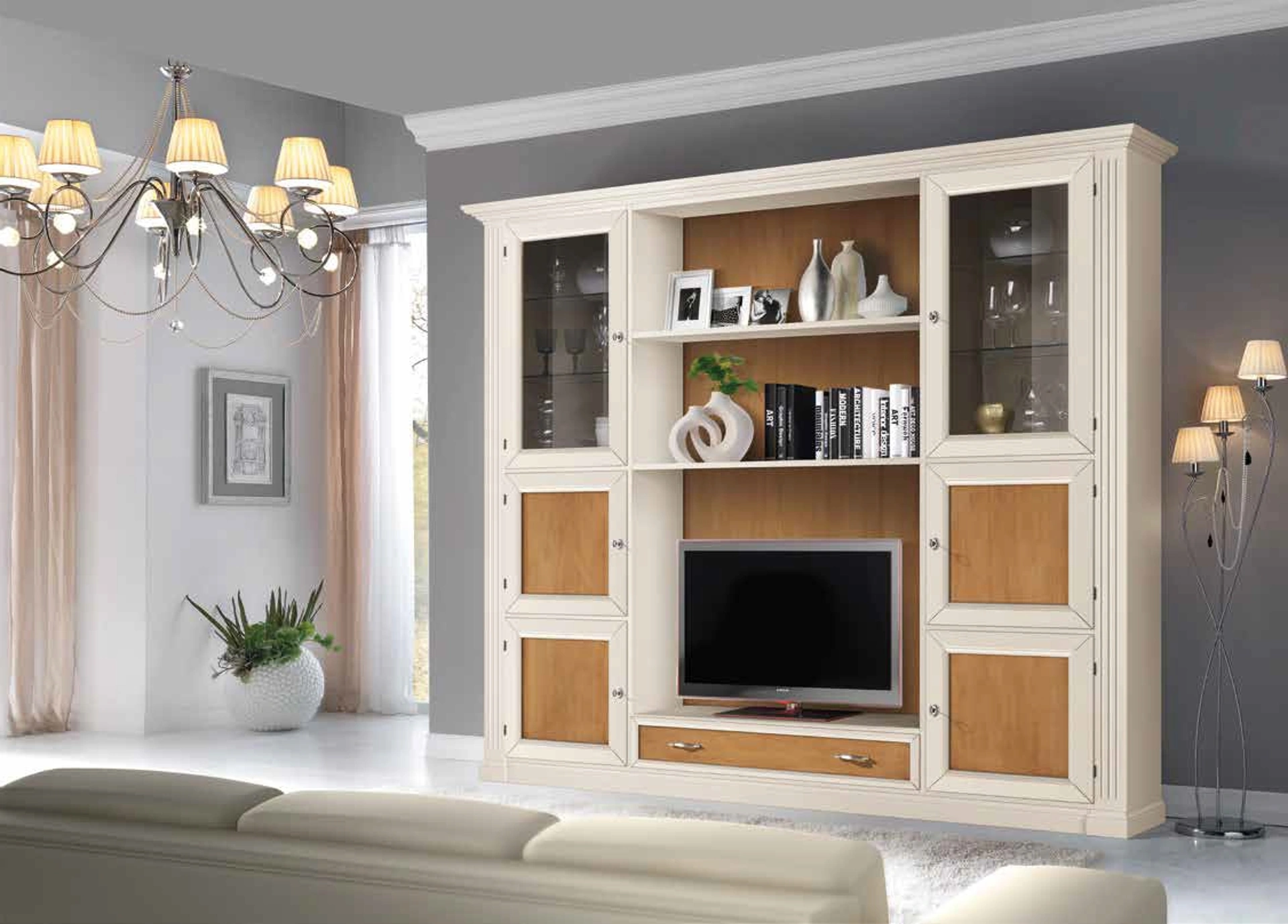 Attraverso un gioco dinamico di accostamenti fra componenti a giorno o vani chiusi, le Pareti Attrezzate classiche arredano il living sfruttando bene ogni spazio. Le Pareti Attrezzate hanno acquisito un posto fondamentale nella zona giorno delle nostre case: sono mobili multifunzionali e salvaspazio sempre realizzabili su misura per te. Questa parete attrezzata è una delle soluzioni dell'azienda e ti permetterà di allestire il living seguendo le più personali problematiche abitative.