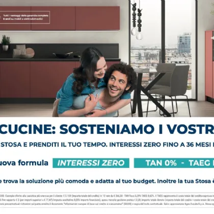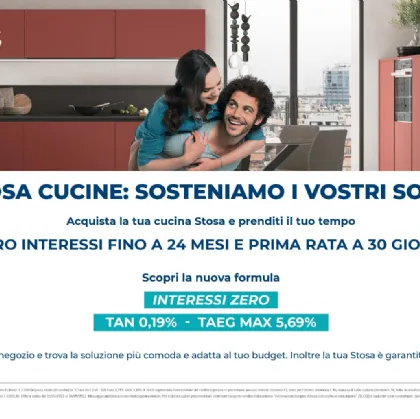 Zero Interessi a 24 mesi e prima rata a 30 giorni. Acquista la tua cucina Stosa e prenditi il tuo tempo.